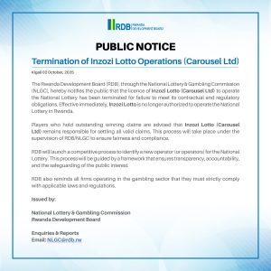 Rwanda Development Board, has announced that news in the announcement they released yesterday, on 02 October 2025, The license was about operating the Rwanda’s national lottery, however RDB said , Inzozi Lotto failed to fullfil their duties ,and did not comply with lottery rules and regulations.